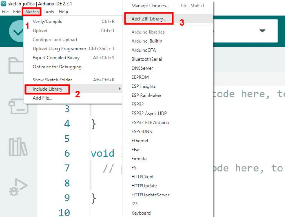 - Abra Sketch → Include Library e verifique se a lista mostra as novas bibliotecas.
